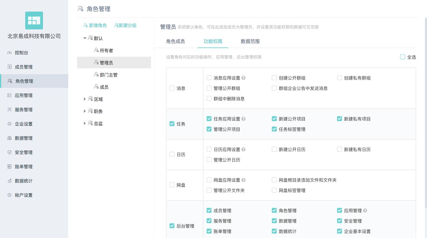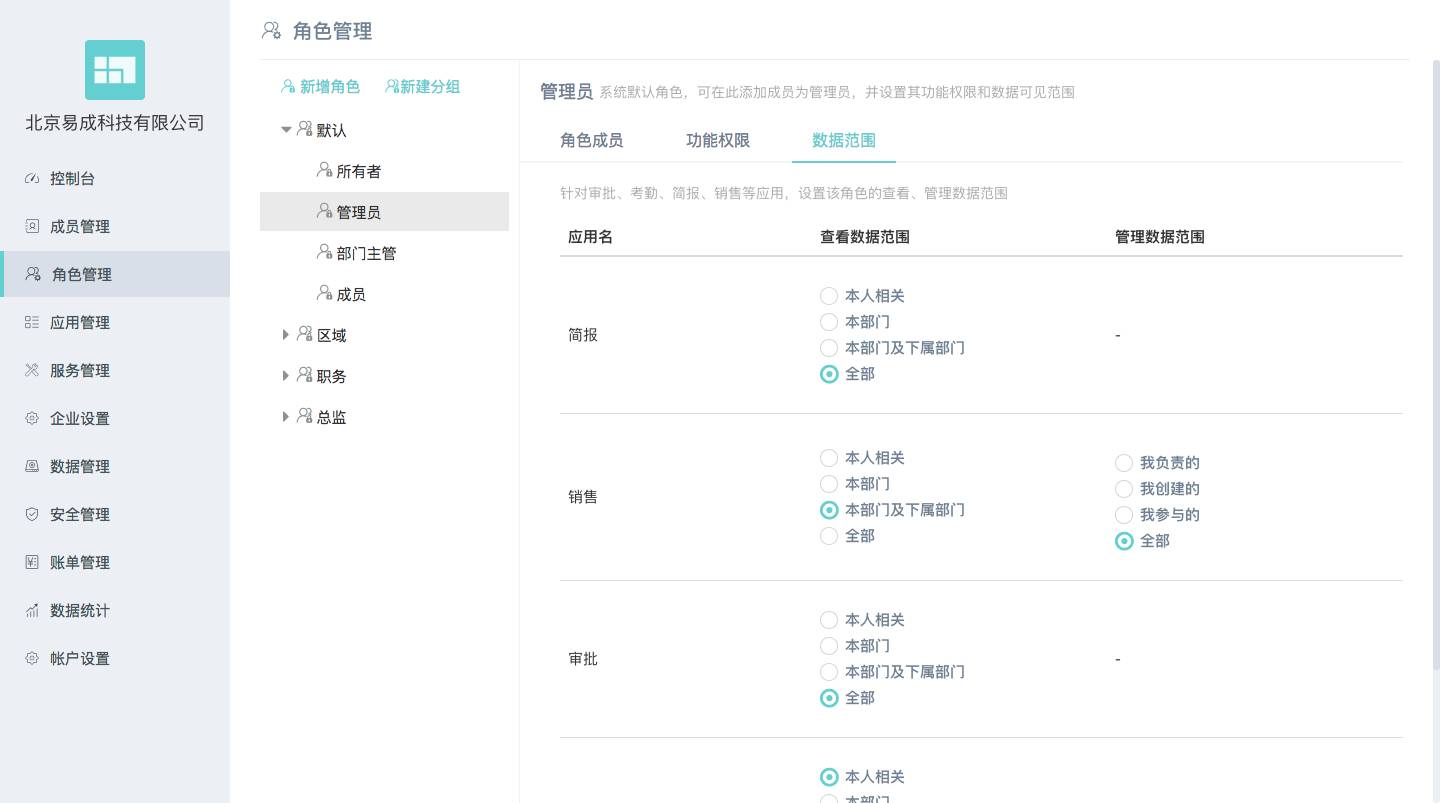 一般情况下,企业成员的操作权限、查看数据范围是通过角色来控制的,例如企业所有者具备最高的功能权限,可以查看公司全部资源,而普通成员只能操作被限定范围内的功能权限和数据。