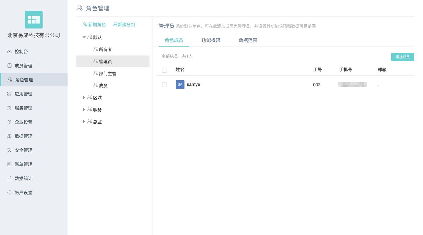 - 成员:系统默认角色,设置除了所有者、管理员、主管外的企业成员应有的基础功能权限和数据可见范围。